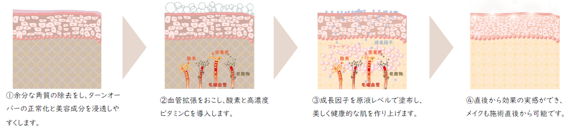 また、酸素を同時導入することで新陳代謝を促し、直後から艶やかな肌を実感できます。